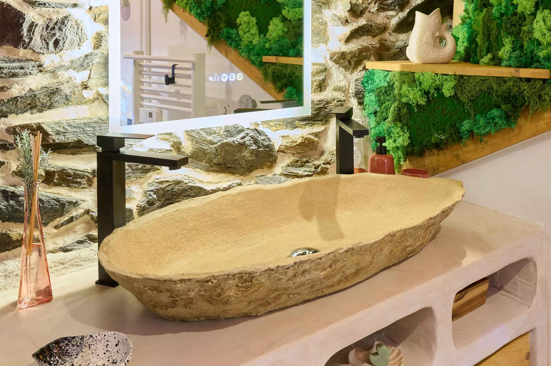 Il est climatisé et chauffé, conçu avec des matériaux nobles et un mobilier artisanal sur mesure. La roche, le bois, le verre : l’ambiance est douce, enveloppante, naturelle.